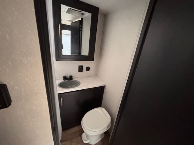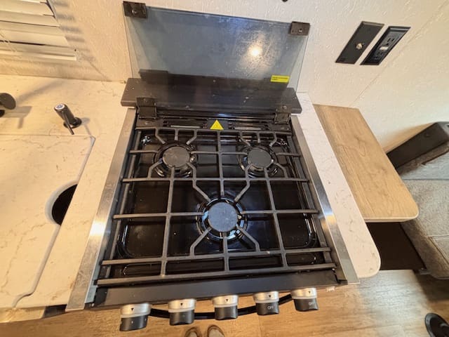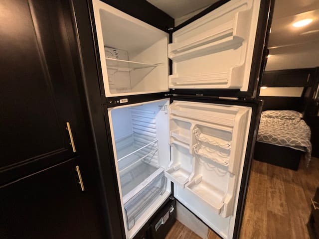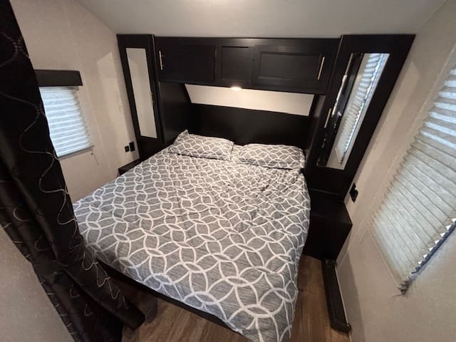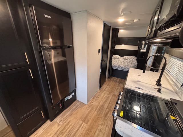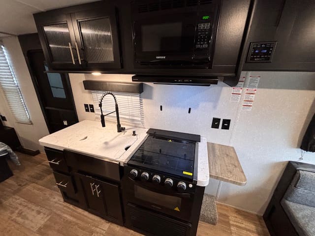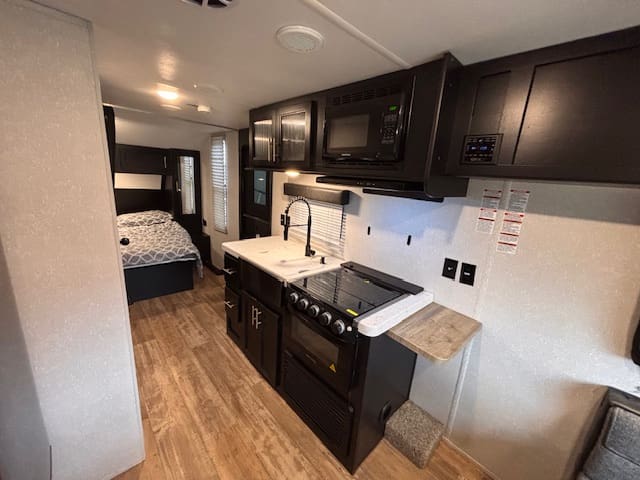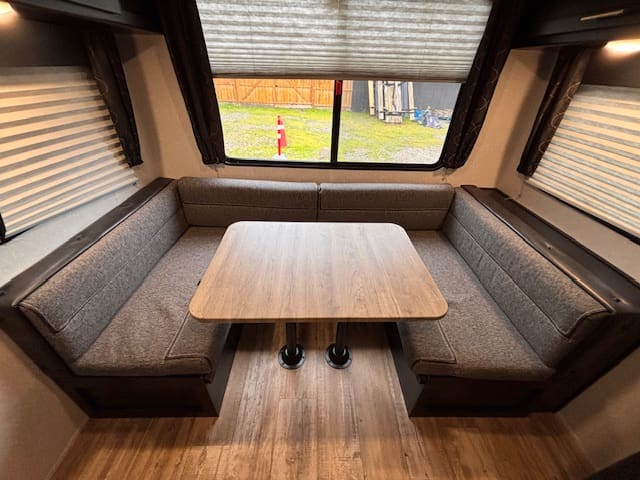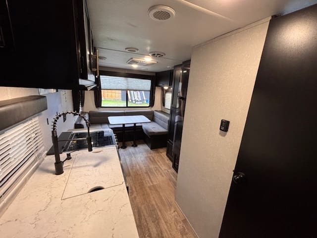 Inside this fun-packed trailer you’ll find a spacious U-shaped dinette that invites lazy brunches, board games, or movie nights under the awning. Up front is a full walk-around RV king bed in a front bedroom that feels like your personal escape after a day of exploring. The kitchen is thoughtfully built too—whip up snacks and meals with ease, thanks to modern touches like appliance upgrades and smart layout.