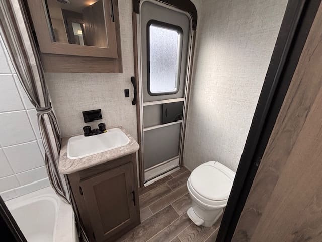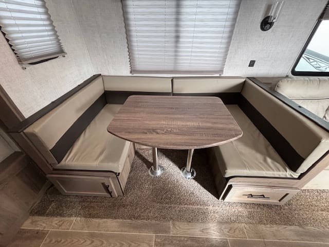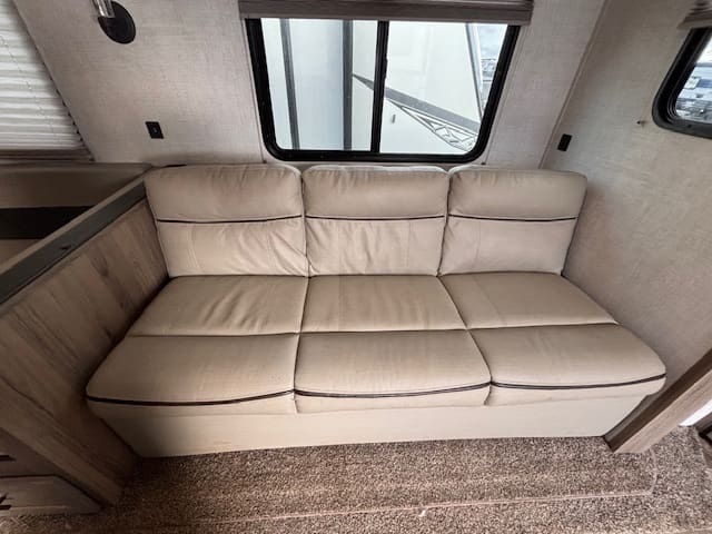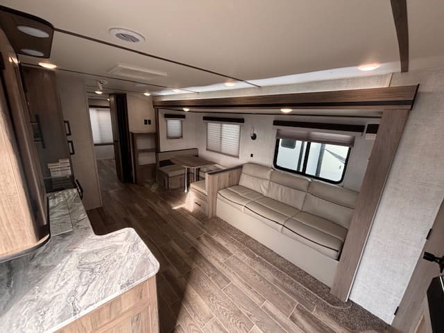 Inside, you’ll find a versatile layout that sleeps up to 9 people, perfect for families or groups. The living area features a dinette and sofa, creating an inviting space for meals, laughter, and downtime.