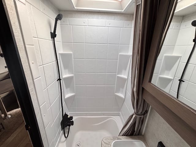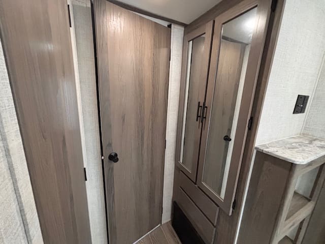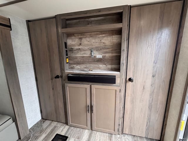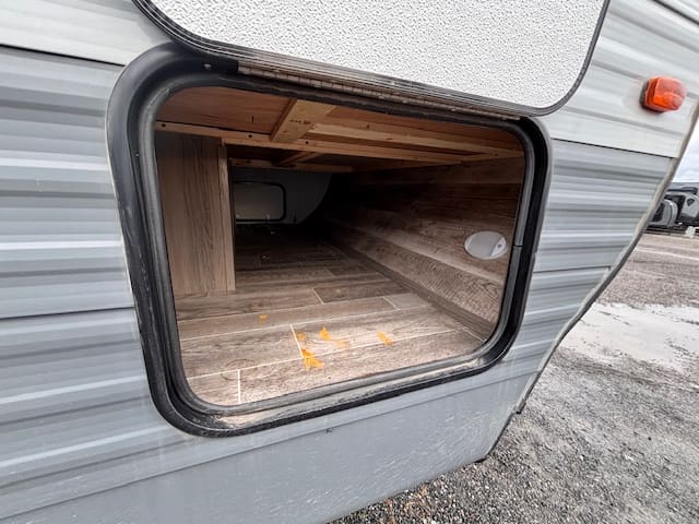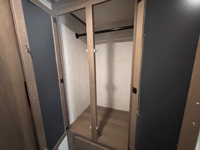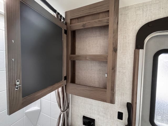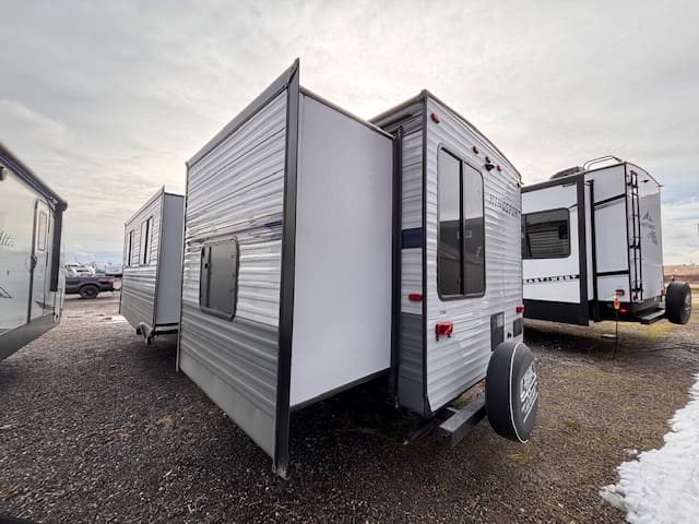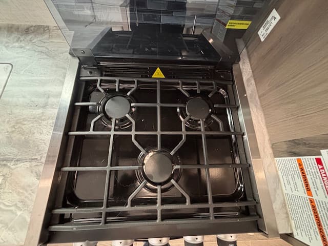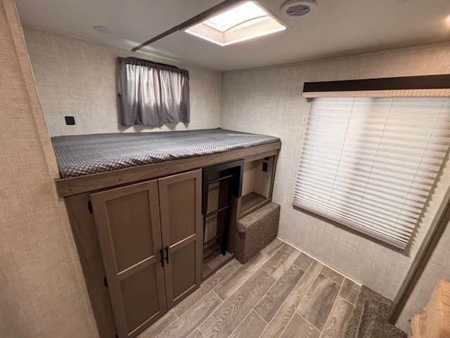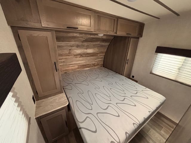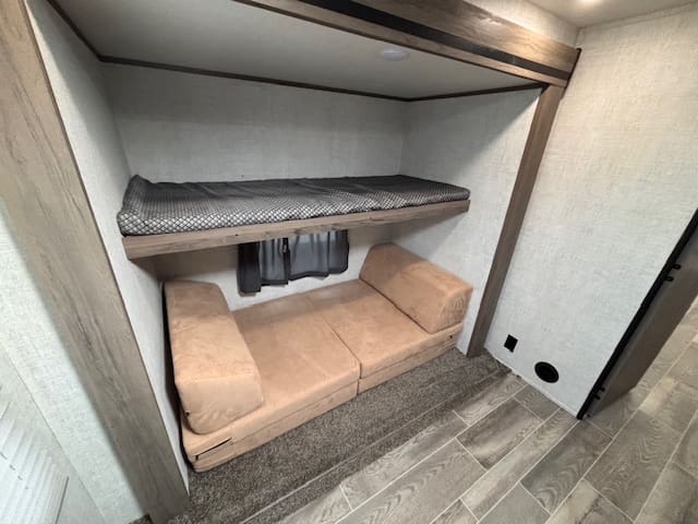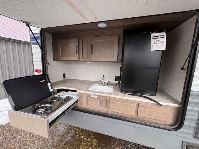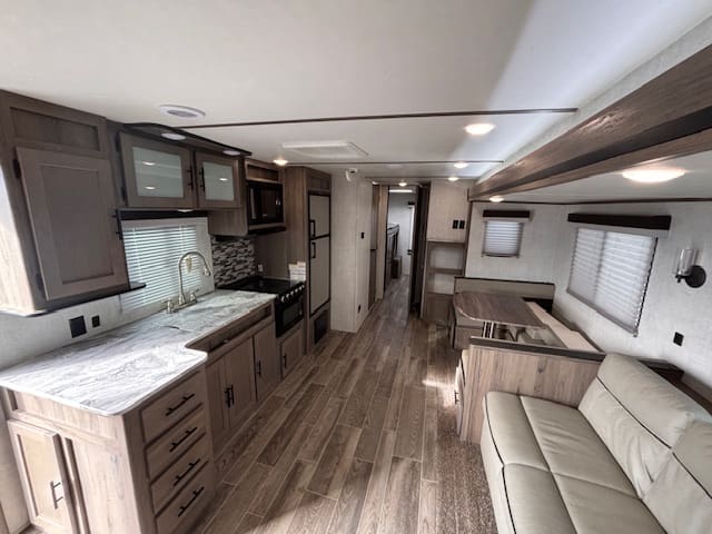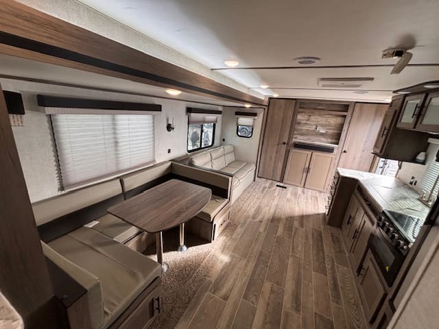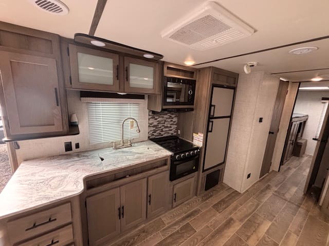 The kitchen is well-appointed, with a 3-burner range, oven, microwave, and plenty of cabinetry — ideal for whipping up everything from campfire breakfasts to hearty dinners. When it’s time to rest, the front private queen bedroom offers a cozy retreat, while the rear area provides flexible sleeping space for guests or children.
