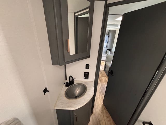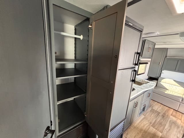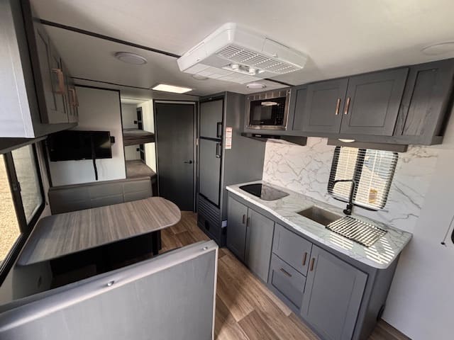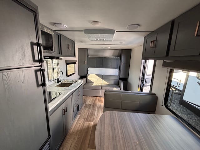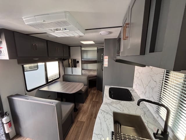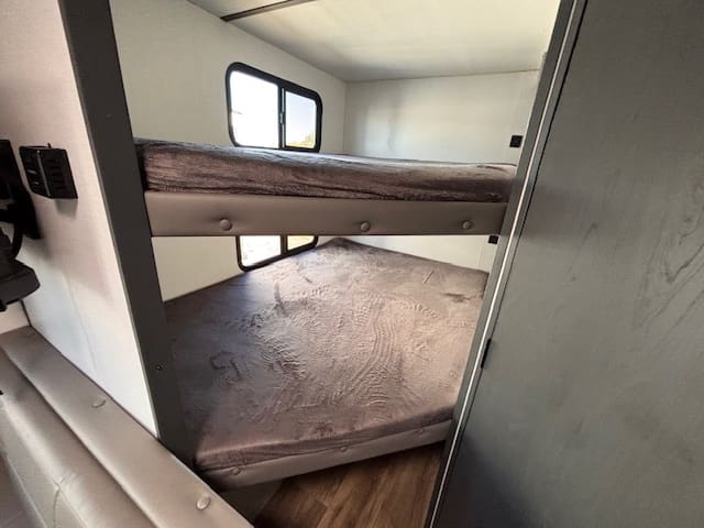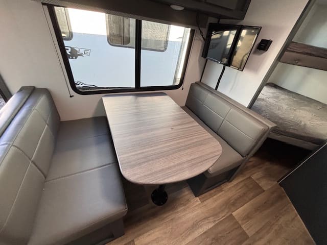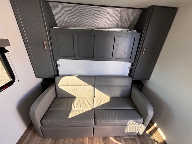 Inside, the standout feature is the rear bunk area—ideal for kids, guests, or even doubling as extra storage if you’re doing gear-heavy trips. Up front, a Murphy-bed/sofa combo gives you flexible living space: daytime lounging or evening sleep, whichever you need. A booth-dinette provides casual dining or game-night space, making it versatile whether you’re parked at a campground or on a longer excursion.