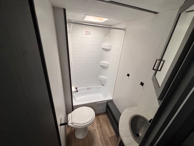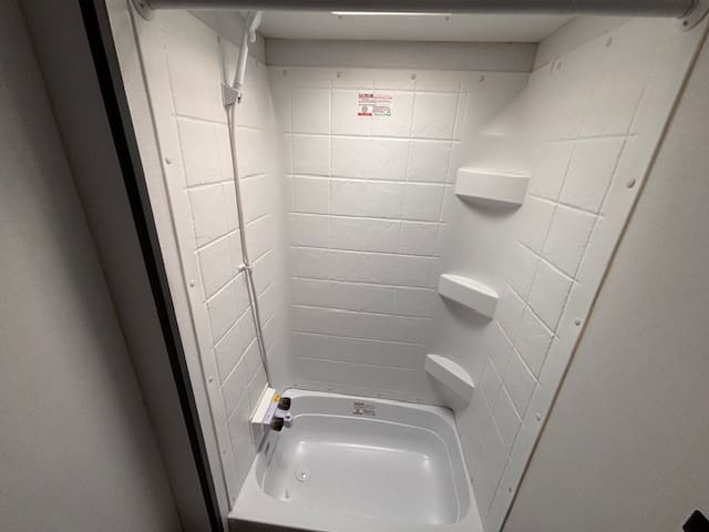 The kitchen and bath are thoughtfully laid out for the size: you’ll get the full conveniences (sink, stove, refrigerator, bath with tub/shower).