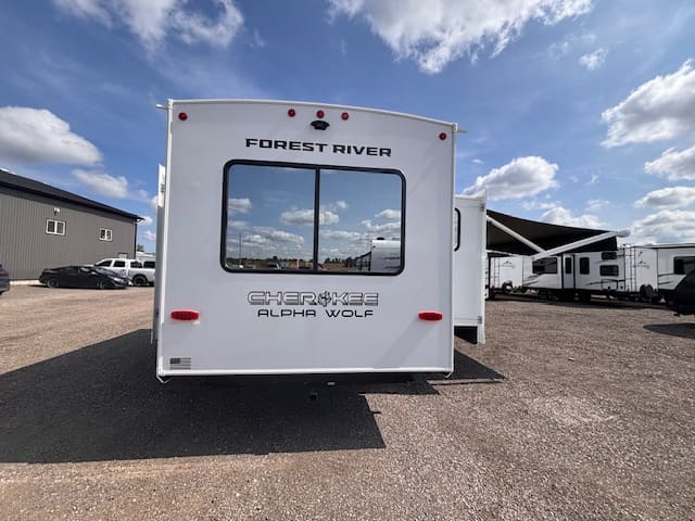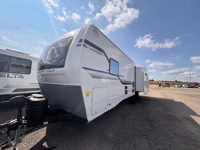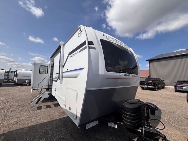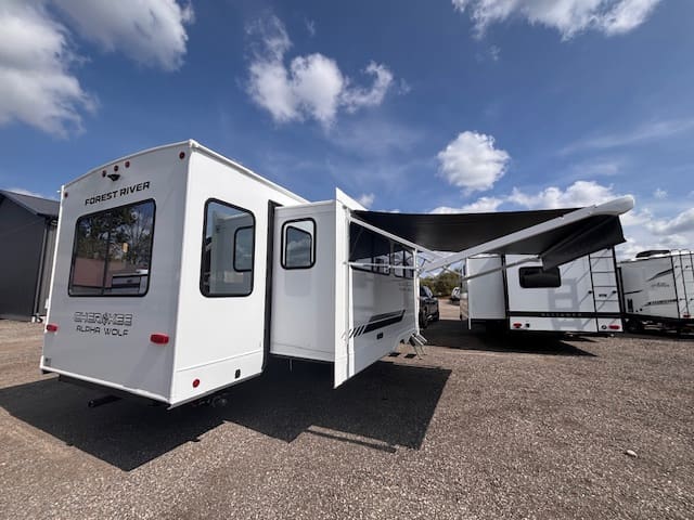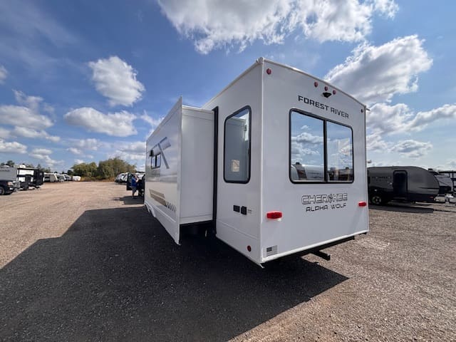 The bathroom offers a spacious shower with skylight, vanity storage, and easy access from both the bedroom and hallway. Outside, the Alpha Wolf 26RL impresses with an oversized awning, outdoor speakers, and pass-through storage. Built with durable construction and equipped with modern tech features, the 2026 Alpha Wolf 26RL is ready to make every camping trip more comfortable, convenient, and unforgettable.