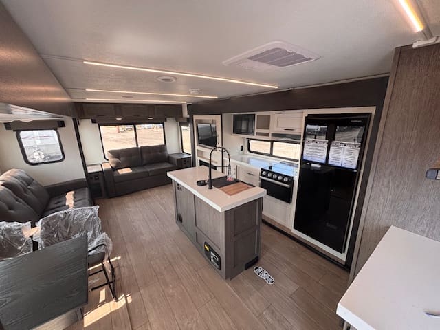 In the kitchen, you’ll find seamless countertops, a farm-style sink, and stainless steel appliances that make meal prep simple and enjoyable. The free-standing dinette or optional booth seating provides plenty of room for dining or game nights. Up front, the private master bedroom features a walk-around queen bed, overhead storage, and dual wardrobes for all your gear.