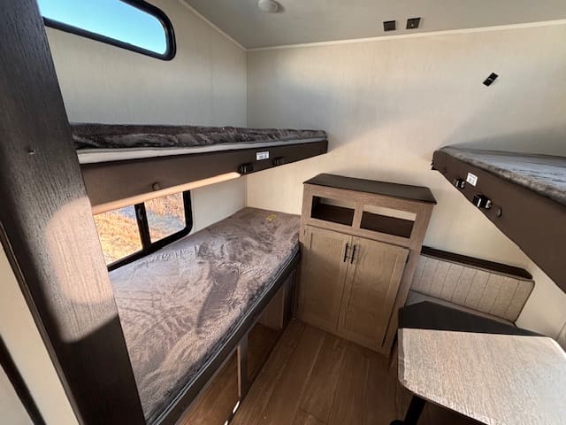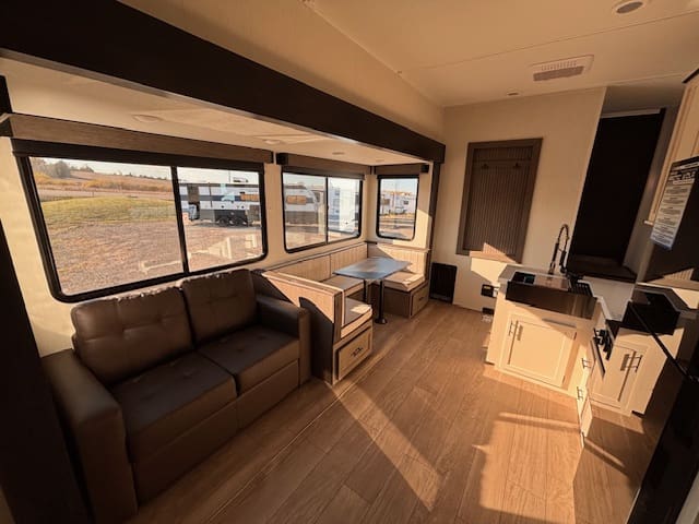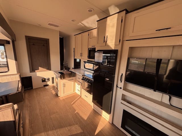 The 2026 Arctic Wolf 285OPT fifth-wheel offers a remarkable blend of family-friendly layout and rugged, all-season construction. Step inside and you’ll discover a thoughtful floor plan: a dedicated rear bunkhouse—perfect for kids or guests—gives way to a spacious main living area with a cozy fireplace, U-shaped dinette, and tri-fold sofa. Up front, a private queen-bedroom offers restful retreat and storage.