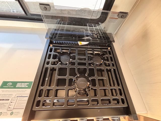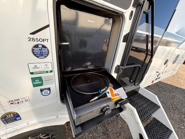 Outside, the living space extends further via a 20-ft power awning and a well-equipped outdoor kitchen.