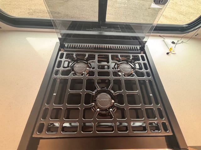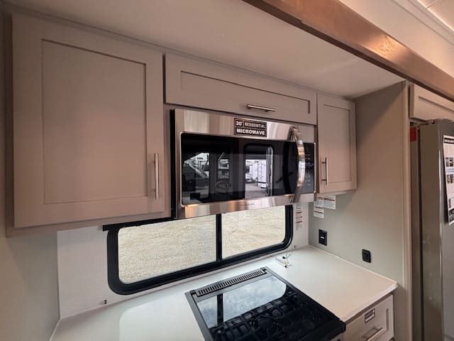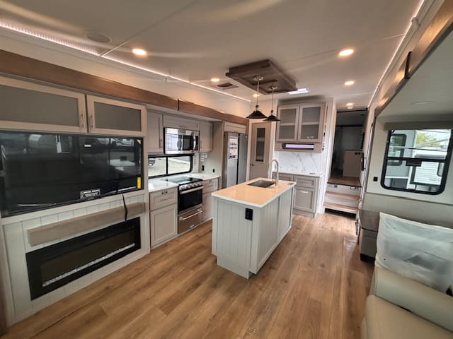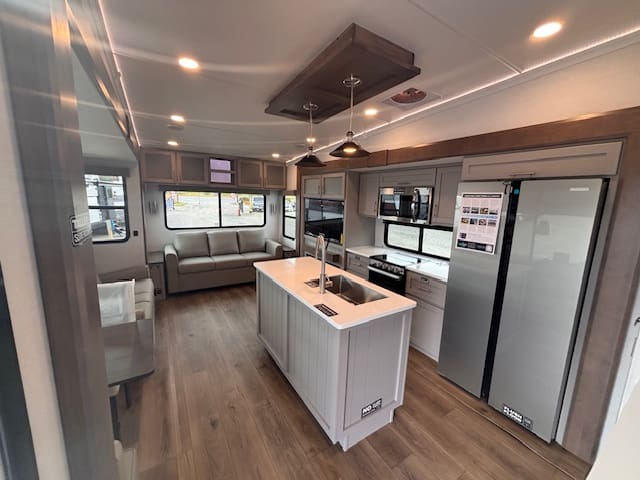 The 32RLS welcomes you with a wide-open living space featuring a trifold sofa, theater seating, and large panoramic windows, allowing natural light to flood the interior. A kitchen island, solid surface countertops, and a residential-size refrigerator ensure you enjoy every culinary moment, whether you’re parked lakeside or deep in the mountains.