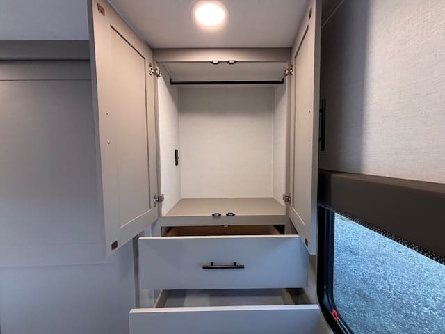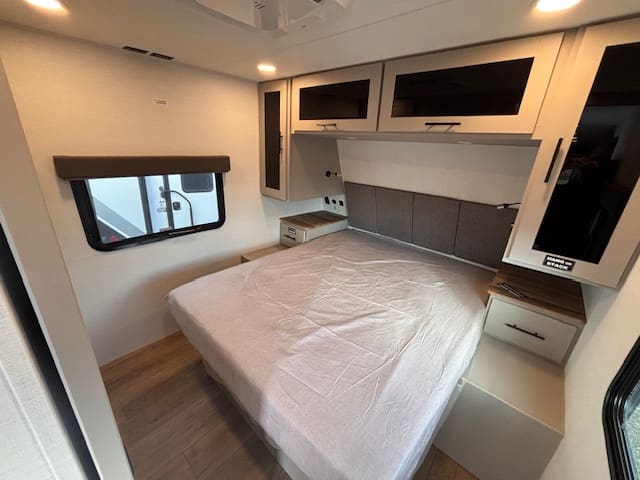 Up front, the private bedroom offers a comfortable retreat with great storage and a relaxing, airy feel. The walk-through bathroom gives you plenty of room to get ready without feeling cramped.