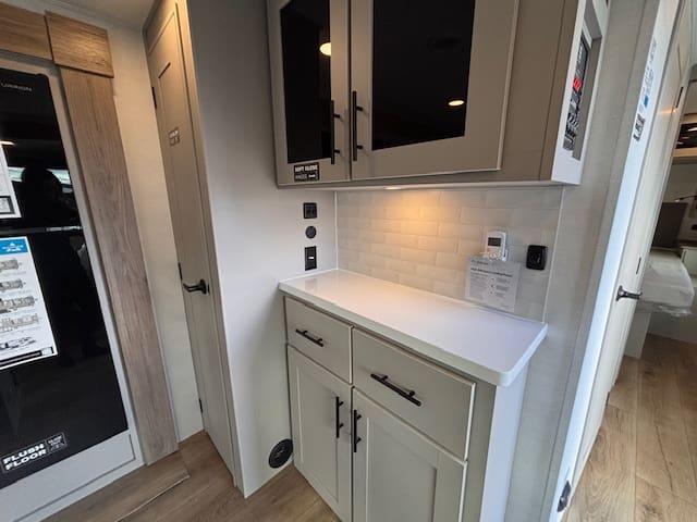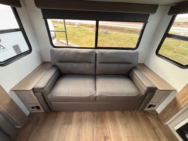 The 2026 Delta 292RL is made for campers who want comfort, style, and good vibes every single weekend. With its bright rear-living layout and wide-open feel, this trailer instantly gives off “welcome home” energy the moment you walk in. Big windows flood the space with natural light, and the dual recliners plus tri-fold sofa create the perfect hangout zone for lazy mornings or. With the push of a button, your TV rises into view for movie nights and game-day excitement, then disappears smoothly back into the cabinet when you want wide-open windows and a clean, uncluttered living space. It’s the perfect blend of tech, convenience, and “wow” factor.