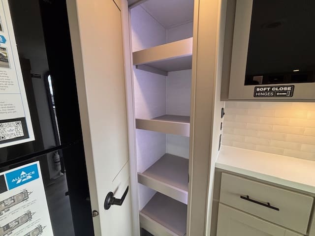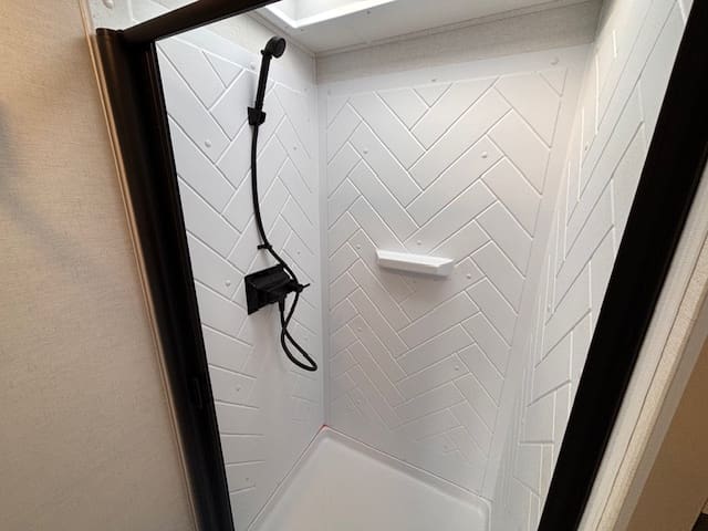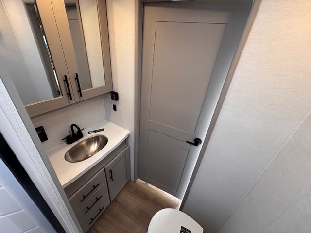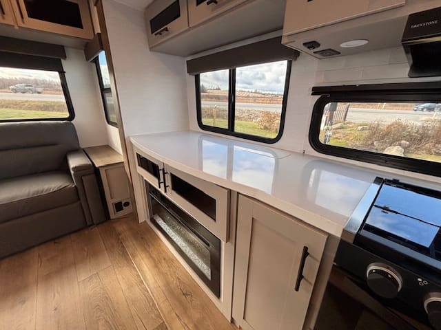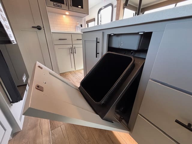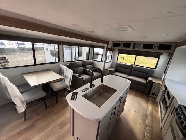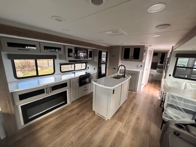 The kitchen is where the fun really happens — a spacious island, tons of storage, and modern appliances make cooking feel effortless, whether you’re flipping pancakes, prepping snacks, or hosting the campsite happy hour. The setup is designed to keep you in the conversation, not tucked in a corner.