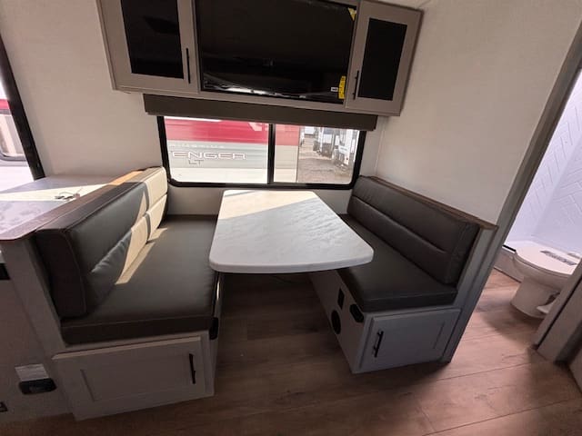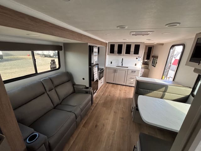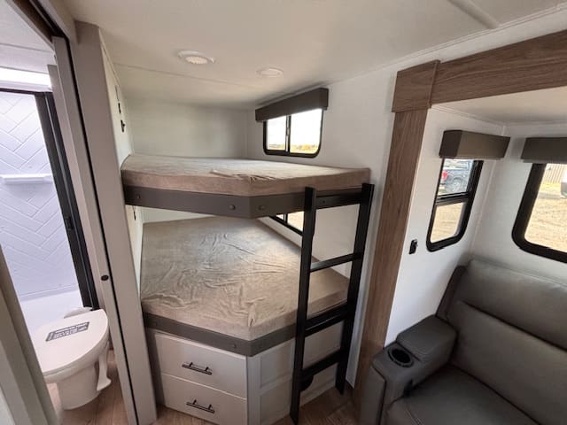 Step inside and you’re greeted by a bright, open living space with room for everyone to relax. The U-shaped dinette invites family meals and late-night board games, while the cozy bunkhouse keeps the kids happy and tucked away with their own space. Up front, the private master bedroom offers a calm retreat after a full day outdoors.