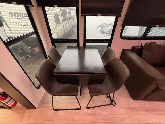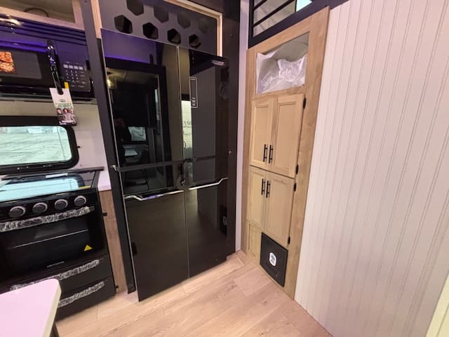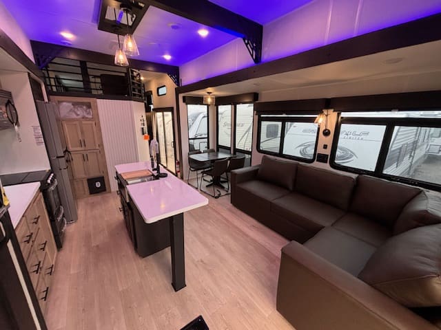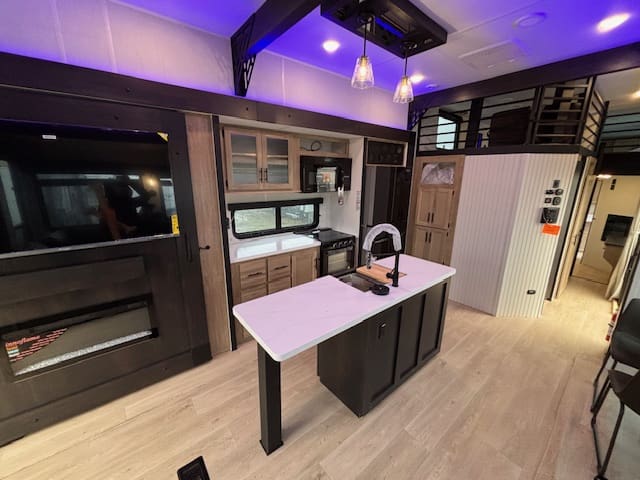 The main living area is all about comfort and good vibes. You’ll love the open floorplan, entertainment setup, and the kind of seating that makes rainy-day lounging feel like a treat. The kitchen brings residential flair with tons of counter space, full-size appliances, and storage for all the weekend (or week-long!) snacks.