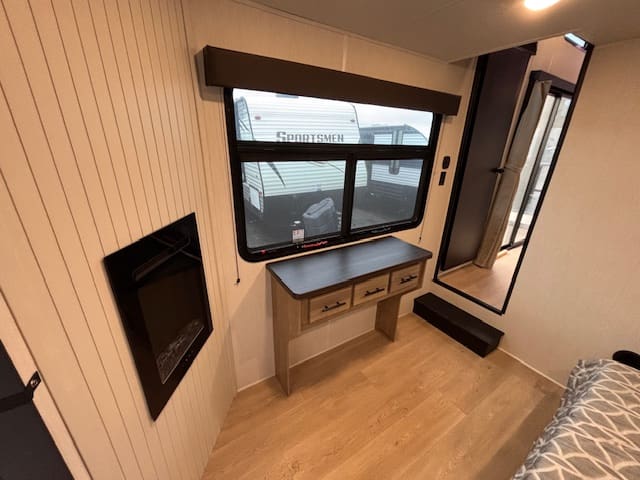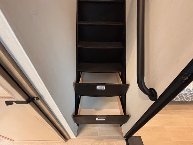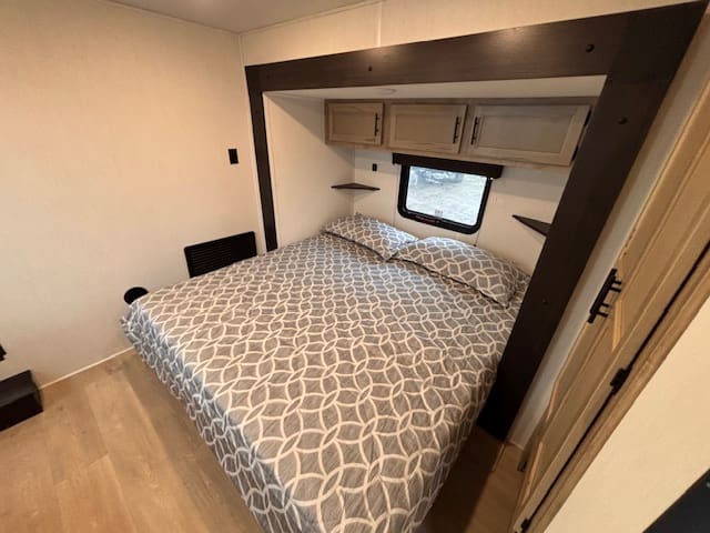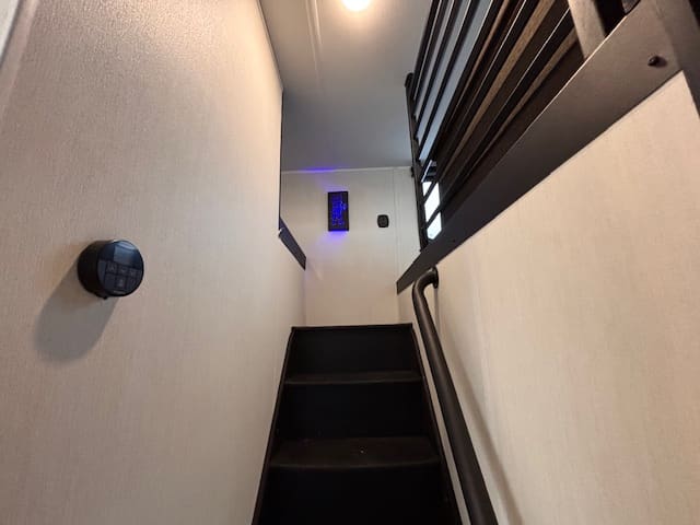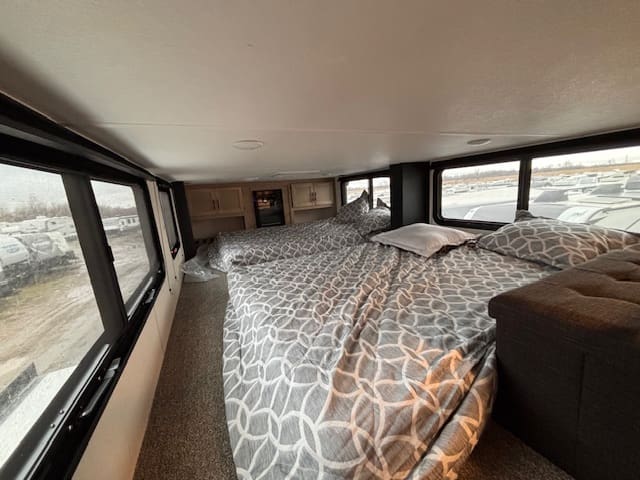 Front and center is the massive dual-queen loft, giving you TWO elevated sleeping zones perfect for guests, kids, teens, or anyone who loves having their own cozy nook. It’s spacious, airy, and surprisingly private — a total crowd-pleaser for families who need room to spread out.